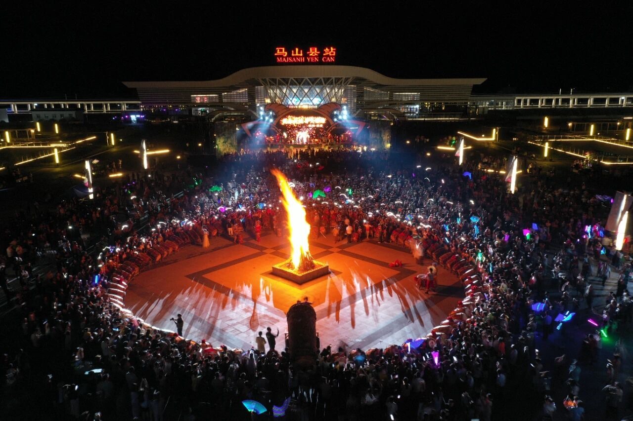当晚,最引人注目的主角非那圈象征着本地文化底蕴的壮鼓莫属。壮鼓围成一圈,鼓手们挥动鼓槌,沉雄浑厚的声浪刹那间喷薄而出。场地正中央,熊熊燃烧的篝火,其火光在人们脸上映出中国红。篝火的跳动与鼓点奇妙地交融在一起,二者共同构成了这场晚会最为动人的核心意象,在鼓声与火光共同营造的“欢乐结界”中,来自各地的游客与本地群众一同欢歌跳舞,大家不分男女老少,手牵着手,围着篝火,随着鼓点和音乐尽情舞动、欢笑。活动的最后,浪漫的烟花秀中满是欢声笑语与激昂乐声,现场变成了一片欢乐的海洋。