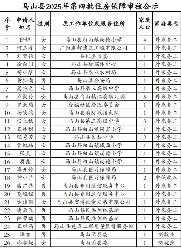 根据《马山县公共租赁住房管理暂行办法》(马政办发【2015】33号)的有关规定,以下申请户通过申请、受理、复核,于2025年10月15日审核通过,符合享受住房保障申请条件,现进行公示,公示期为7天,如对公示对象有异议,请以书面的形式,并署真实姓名和联系地址,于2025年10月23日前邮寄或直接送达马山县住房和城乡建设局(邮寄的以邮戳日期为准;直接送达的以送达日期为准)。