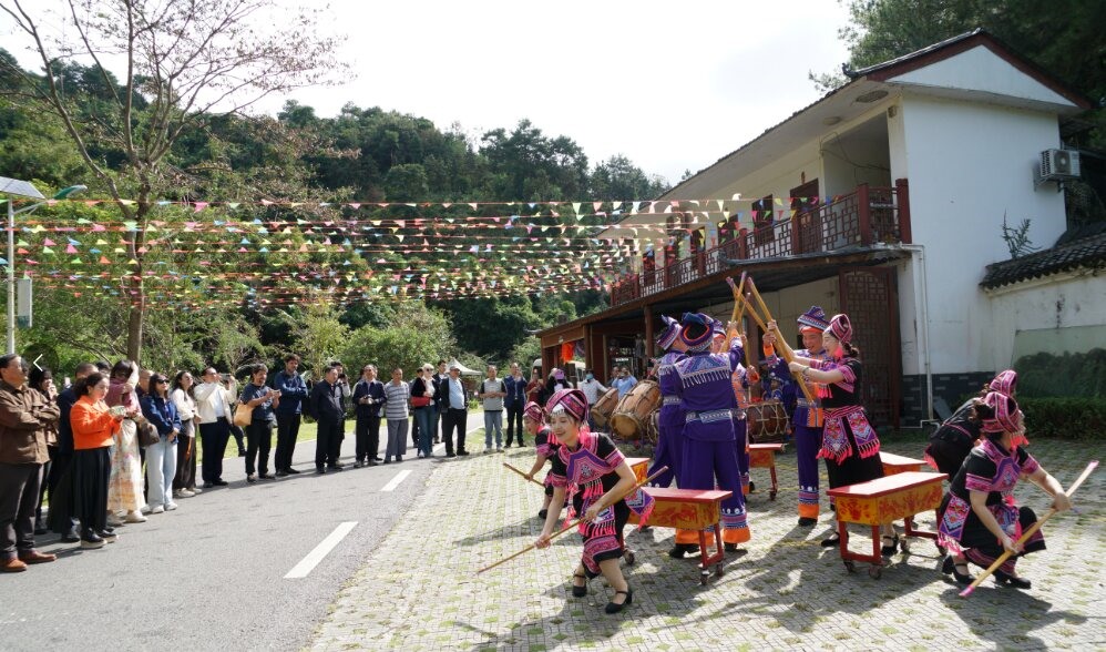 走进古零镇水锦顺庄峡谷景区,采风团首先感受到了浓郁的壮族文化气息。依托自然山水打造的乡村示范项目,既有“绿树村边合”的田园风光,也有“歌满寨、鼓震天”的民族风情。壮族会鼓的雄浑鼓声在山谷回荡,鼓手们身着蓝布衫、扎红腰带,动作整齐如军阵。随后登场的壮族扁担舞,几名舞者手持竹扁担,敲击声时而轻快如溪流,时而急促如稻穗摇风,将农耕生活场景化为灵动舞姿。扁担舞后,壮族三声部民歌悠扬响起,歌声唱出丰收喜悦与邻里和乐。优美的自然景观、浓厚的民族风情,令采风团成员沉醉其中。