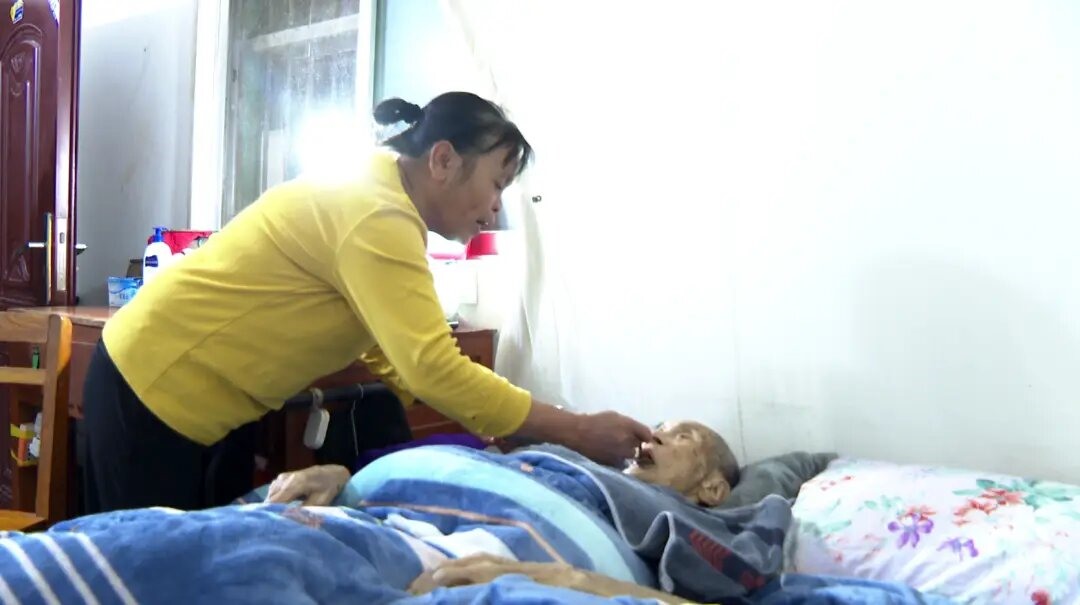 在刘建修老人的房间里,小儿媳端着一碗温热的稀粥,小心翼翼地送到父亲嘴边。老人吃得不多,她耐心地一勺一勺喂着,眼神始终关注着老人的状态。老人的床边放着一张小床,这是小儿子刘永年的床位,他与老人同住一室,为了方便随时起身照应老人。