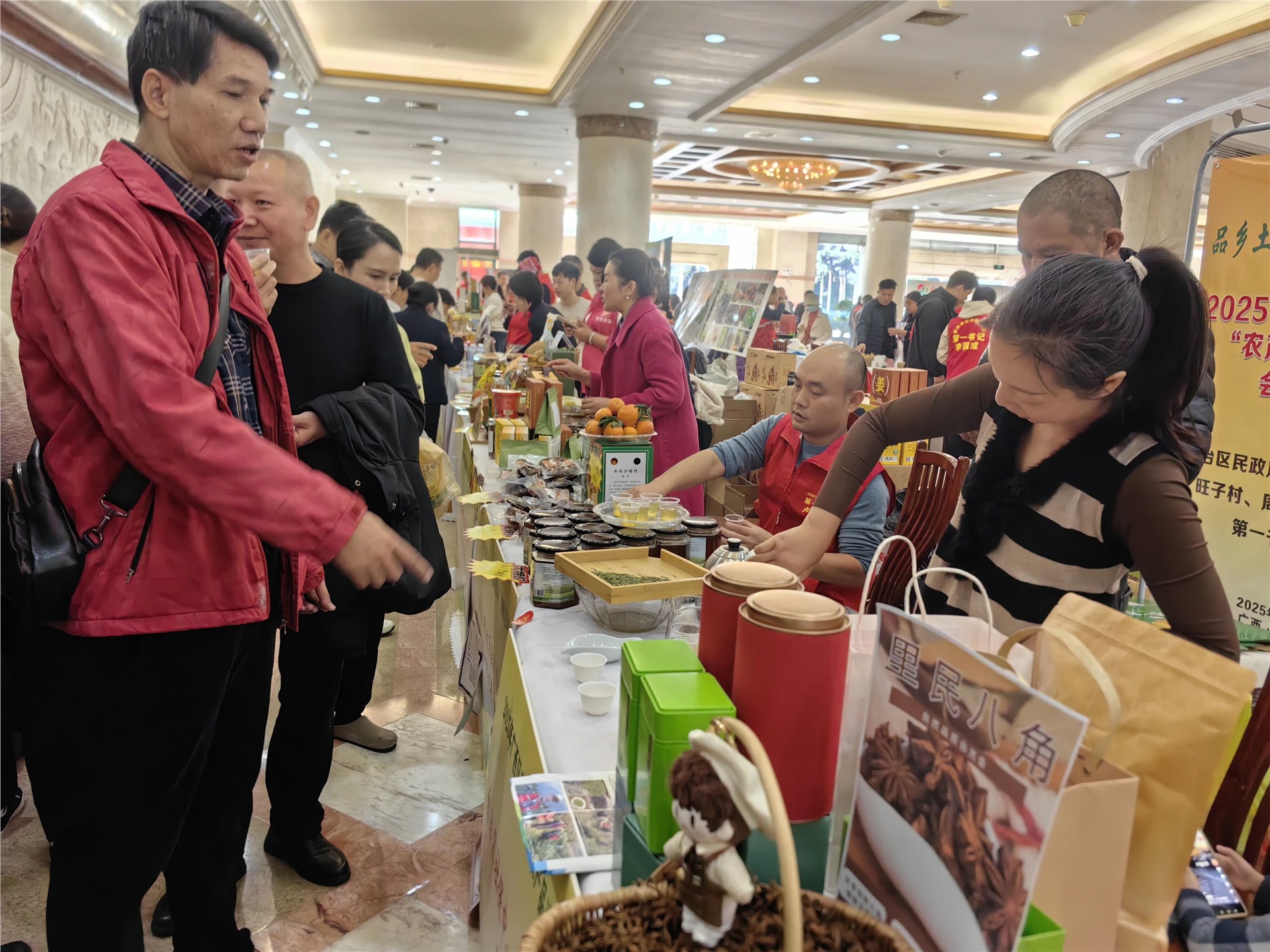 11月21日,以“品乡土好物 促乡村振兴” 为主题的广西区直机关 “农产品进机关” 展销活动在广西人民会堂举办,活动现场汇集了数百种特色农产品,我县第一书记带去的山茶油、马井茶、八角,凭借鲜明的乡土特色和优良品质,吸引了区直机关各单位参观者驻足咨询、洽谈合作,成为展会现场的“人气焦点”。