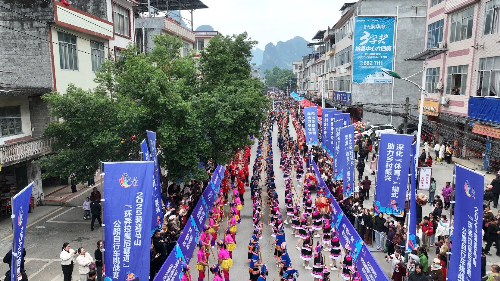 2025年12月28日,“骑遇马山—弄拉皇后赛段”公路自行车挑战赛的配套活动——加方乡村嘉年华于加方乡街区盛大开幕。本次活动涵盖壮族会鼓、千人打扁担、农耕文化体验、山货一条街、百桌壮宴等10余项特色内容,吸引众多游客近距离感受加方的文化魅力与烟火气息。