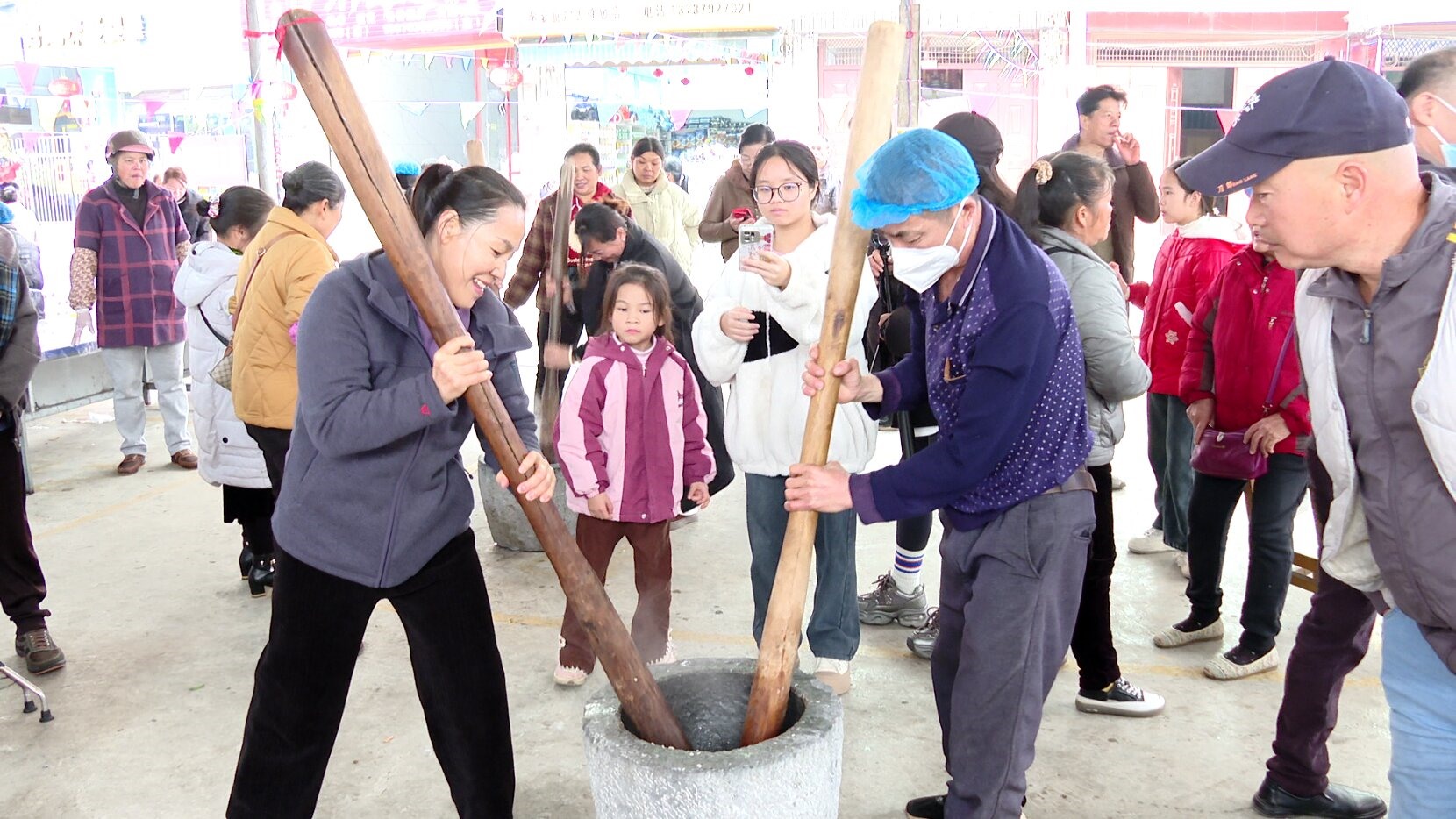 与此同时,农耕文化体验区气氛热烈。糍粑捶打、豆腐酿、旱藕粉制作等场景吸引众多游客驻足参与。在糍粑捶打区,游客两两一组手持木槌,在石臼中交替捶打糯米团,现场欢笑声与捶打声交织不断。豆腐酿摊位前,几位阿姨正熟练地将调好的馅料填入豆腐泡中,游客们围在一旁认真学习、参观。整个体验区充满欢声笑语,游客们在亲手参与中感受农耕文化的魅力,体验传统手工艺带来的乐趣。