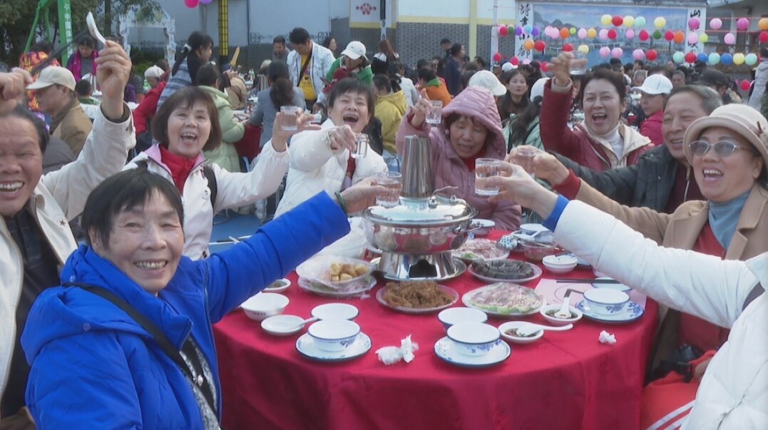 启动仪式后,游客移步小都百景区篮球场,暖心碳火火锅宴已然开席。热气腾腾的火锅搭配本地新鲜食材,汤汁翻滚间香气四溢,更有极具特色的高山流水敬酒互动点燃现场氛围——村民们身着民族服饰,手持酒壶搭成酒阵,清冽米酒顺流而下,敬向席间游客,歌声与欢呼声交织,在冬夜里传递着最质朴的热情与烟火气。