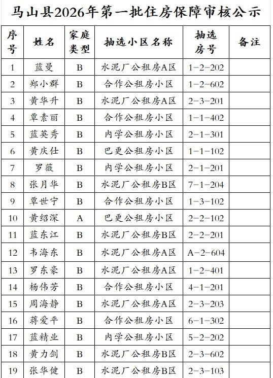 根据《马山县公共租赁住房管理暂行办法》(马政办发【2015】33号)的有关规定,2026年3月12日上午,在住建局二楼会议室举行公开抽选房号仪式,现将公开抽选房号结果公示,公示期为7天,如对公示对象有异议,请以书面的形式,并署真实姓名和联系地址,于2026年3月20日前邮寄或直接送达马山县住房和城乡建设局(邮寄的以邮戳日期为准;直接送达的以送达日期为准)。
